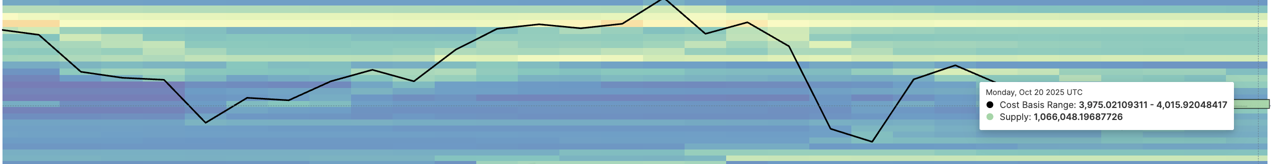 Right now, a dense resistance band exists between $3,955 and $4,015, with about 1.06 million ETH purchased in this range. This makes the area just above the current ETH price difficult to break, as every move toward $4,000 brings more selling pressure.