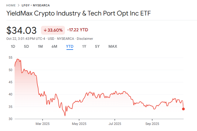 A second ETF that launched this year, the long-winded YieldMax Crypto Industry Portfolio Option Income ETF (LFGY), has a reported distribution of 19.9% annualized.