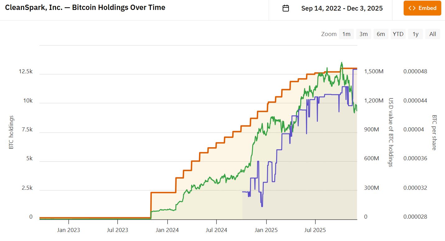 CleanSpark has amassed more than 13,000 BTC on its balance sheet. Source: BitcoinTreasuries.NET