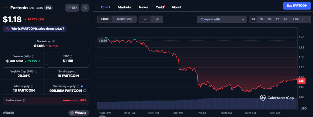 Fartcoin has plummeted continuously from $1.6843 on 23 July.