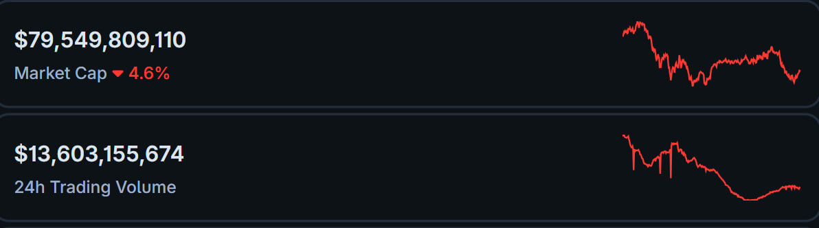 CoinGecko data shows the meme coins’ market cap plunged 4.6% the previous day to $79.55 billion.