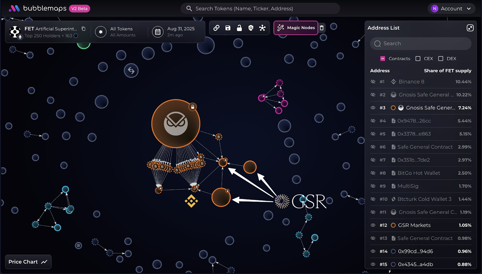 Between July and August, per Bubblemaps’ research, the Ocean team sent some of the FET to over-the-counter (OTC) trading firm GSR, and split the rest across 30 new wallets. By mid-October, Bubblemaps reports, a total of approximately 270 million FET — including from most of the 30 wallets — had been sent to Binance or the OTC provider.