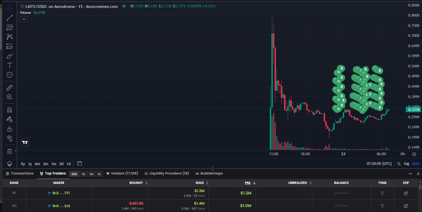 The team, however, actively participates in the concentrated liquidity on Aerodrome. This means the wallet is keeping the price of LMTS within an undisclosed range. After the initial launch, the wallet sold some of the tokens, leading to the initial price slide.