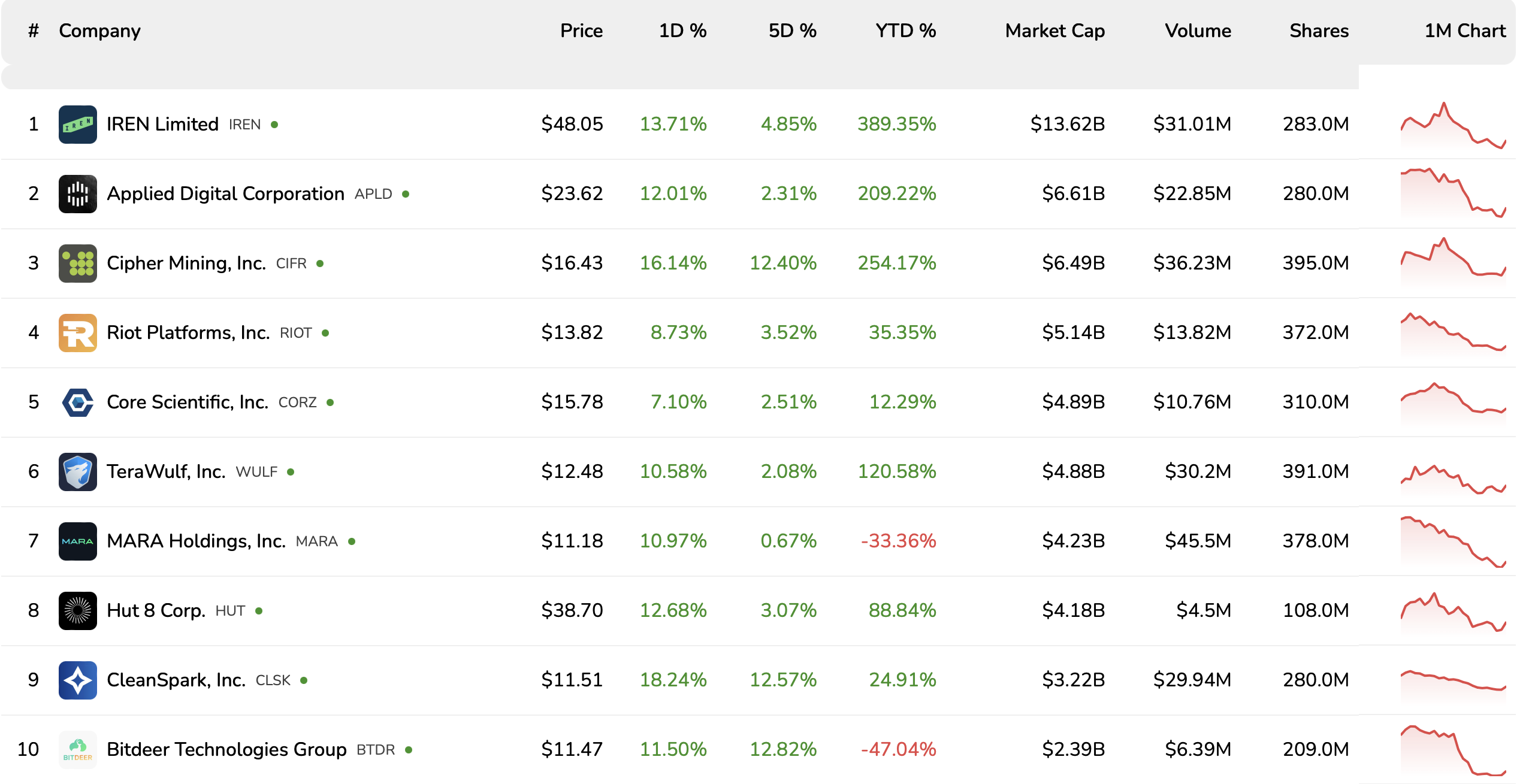 Despite the sectorâs tightening economics, the top ten publicly traded miners were all higher over the past 24 hours, with CleanSpark, Cipher Mining and IREN posting double-digit gains on Monday.