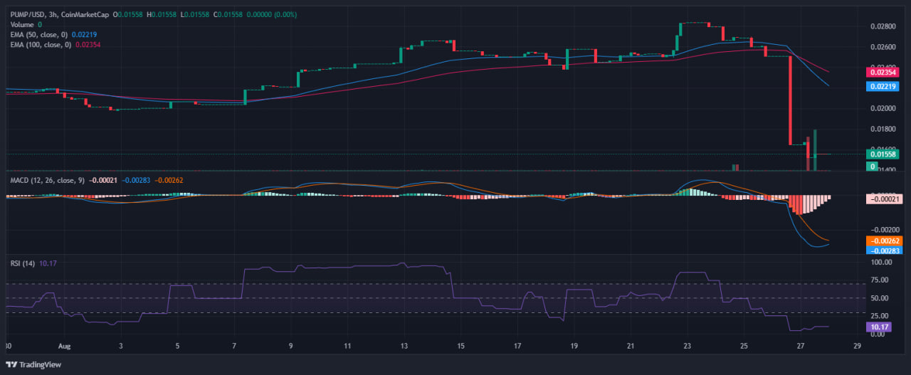 PUMP changes hands at $0.01557 after losing 28% and 40% in the past month and week.
