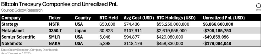 Galaxy Research noted that several BTC DATs, including Metaplanet and Nakamoto (NAKA), aggressively built their positions, with average Bitcoin cost bases exceeding $107,000.