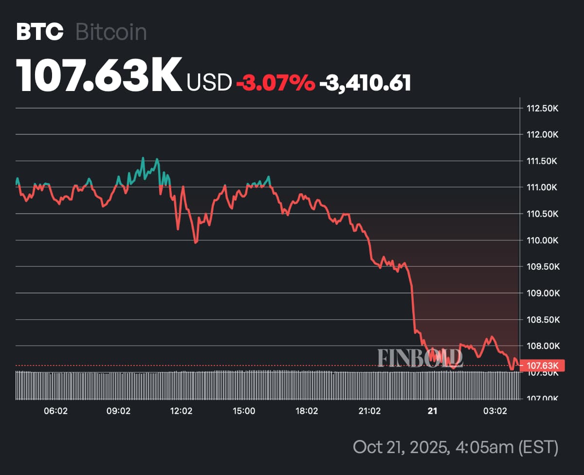 Bitcoin slid 3.07% in 24 hours to trade at $107,580, underperforming the broader crypto market’s decline of 2.96%. Despite holding the key $107,000 support level, the benchmark crypto has now logged a 30-day drop of 6.74%.